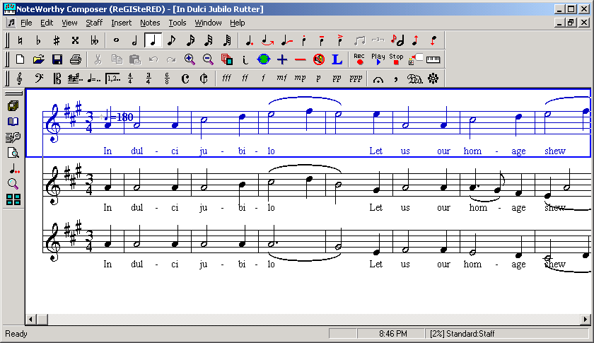 Pour lancer la lecture, cliquez sur « Play » ou "F5"; « Stop » ou "F6" pour arrêter. Pour lire à partir d’un endroit précis, cliquez dans la mesure à partir de laquelle vous voulez commencer, avant de faire « play ». Pour faire taire ces fichues sopranes 1 ;-) ou les autres, cliquez sur la portée que vous voulez (elle apparaît en bleu) et cliquez ensuite sur l’icône « Mute staff » (à gauche du L bleu). Lorsque vous commencez à maîtriser un morceau suffisamment pour chanter avec toutes les voix, mais pas tout à fait, je vous conseille de changer d’instrument de musique sur votre voix, pour qu’elle ressorte sur le piano. Pour cela, clic droit sur la portée, « staff properties », puis dans l’onglet « instrument » vous choisissez votre instrument. (J’aime bien « clarinet ») Si malgré les explications vous êtes encore complètements perdus ou si vous voulez une précision, n’hésitez pas à m’envoyer un mail !